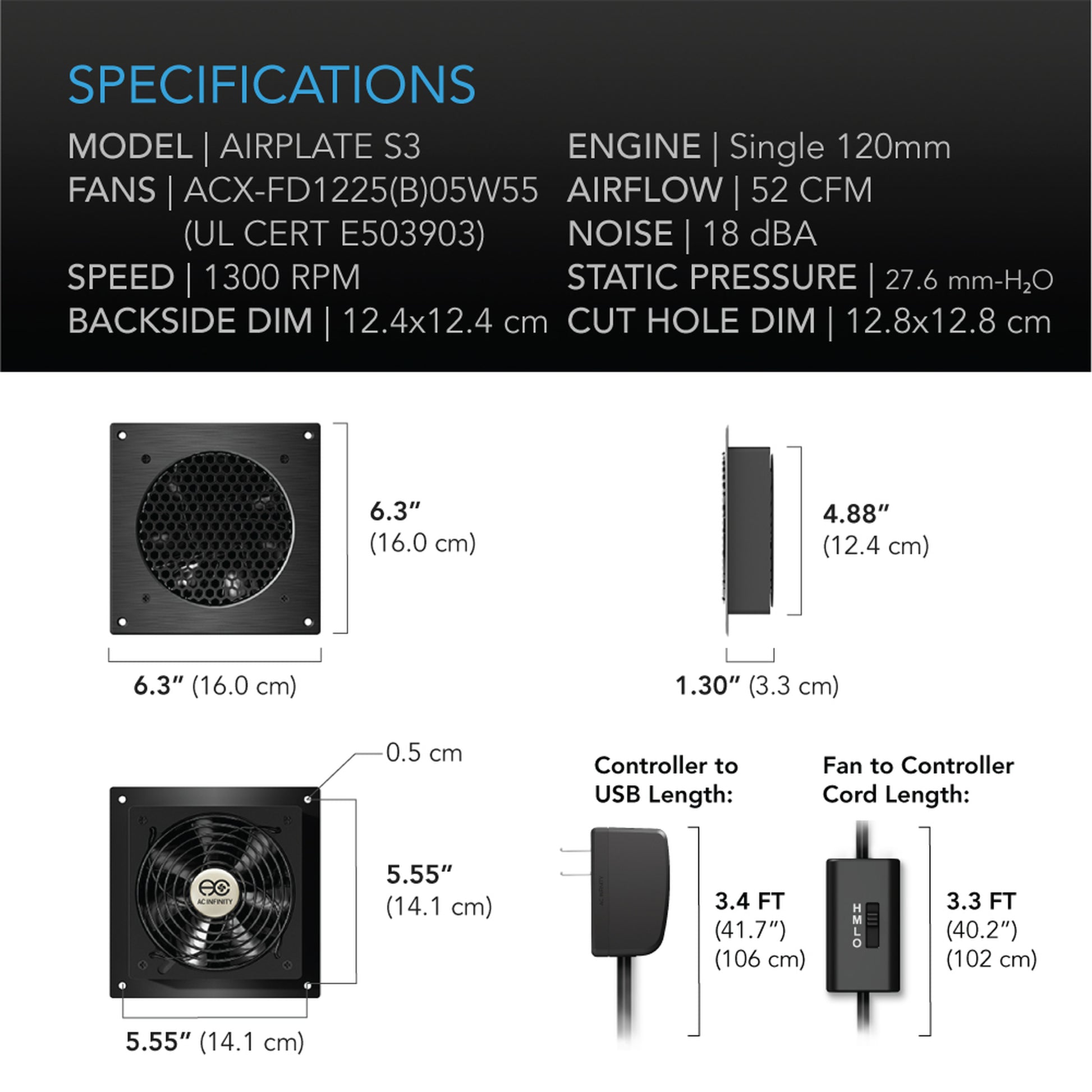 The ultra-quiet fan system is designed to cool home theaters, entertainment centers, and audio video cabinets. Features a speed controller and 6 foot power cord. Included fans use a custom motor engineered to minimize noise during speed variations and are certified by CE and RoHS. Contains AC Infinity axial fans ACX-FD1225(B)05W5 which meet UL-507 standards for safety under Underwriters Laboratories certificate E503903. Containing dual ball bearings rated at 67,000 hours, the unit can be mounted in any direction. Features a CNC machined aluminum frame with a modern brushed black finish. Fans are set to exhaust air out the frame but this can be reversed to intake air using a screw driver. Includes all necessary hardware to easily mount the unit onto a cabinet and power it through an USB port or standard wall outlet.