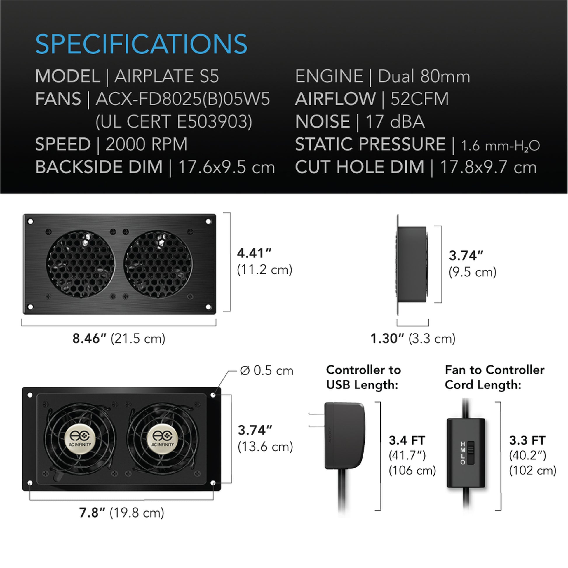 The ultra-quiet fan system is designed to cool home theaters, entertainment centers, and audio video cabinets. Features a speed controller and 6 foot (1.8 meter) power cord. Included fans use a custom motor engineered to minimize noise during speed variations and are certified by CE and RoHS. Contains AC Infinity axial fans ACX-FD8025(B)05W5 which meet UL-507 standards for safety under Underwriters Laboratories certificate E503903. Containing dual ball bearings rated at 67,000 hours, the unit can be mounted in any direction. Features a CNC machined aluminum frame with a modern brushed black finish. Fans are set to exhaust air out the frame but this can be reversed to intake air using a screw driver. Includes all necessary hardware to easily mount the unit onto a cabinet and power it through an USB port or standard wall outlet.